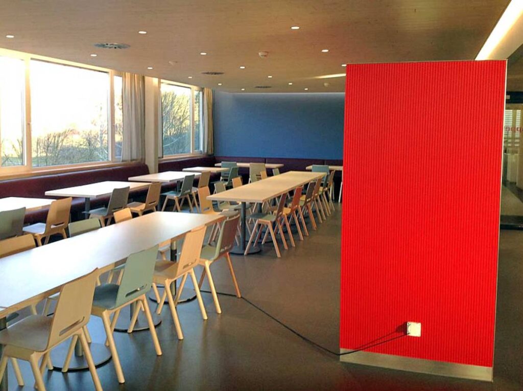 Nachdem die Gestaltung der Kantine anhand des Style-Guides erarbeitet und umgesetzt war, fehlte noch ein passender Wandschmuck. Ein Alpenpanorama sollte es sein. Nach einer Odyssee durch schweizer Wohnzimmer, Brockenstuben, Onlineplattformen und sonstige illustre Orte, gelang es, eine fast durchgängige Alpenkette zu installieren!